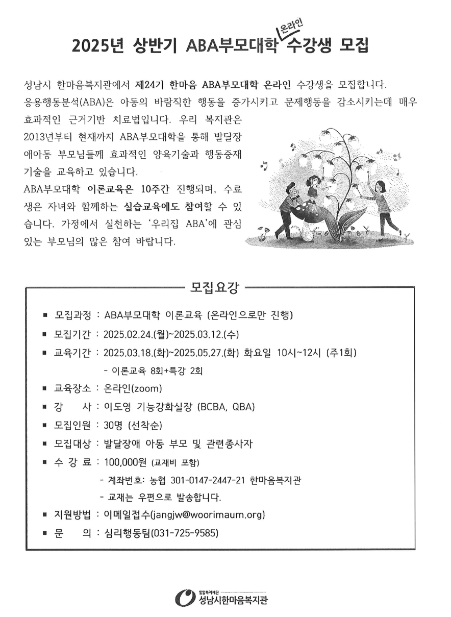 [홍보] 성남시 한마음복지관 2025년 상반기 ABA 부모대학 수강생 모집 (온라인 과정)
